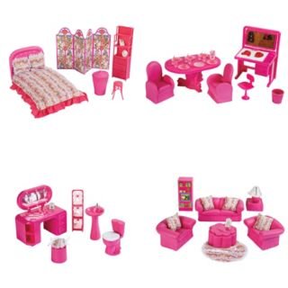 A complete houseful of furniture for the bedroom bathroom family room and dining room All can be used with 11-12 dolls Includes bed bedding and pillows night table lamp with shade screen dressing vanity with mirror and fabric covered seats picture frames and vanity accessories dresser s Read More..