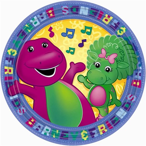Barney and Baby Bop are featured on each plate on a yellow background with music note accents The words Barney Friends are written along the outside edgeulliIncludes 8 paper platesliliDimensions 9 inch diameterliulPFONT COLORREDThis product is not eligible for returnF Read More..
