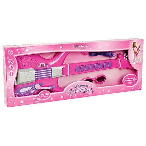 The Dream Dazzlers Stylin Guitar has 8 sound effects 3 demo songs a whammy bar and light up strings The guitar comes with a shoulder strap and sunglasses so you can play with style 8 Sound Effects 3 Demo Songs Whammy Bar Light Up Strings Shoulder Strap And Sunglasses So You Can Play With Style Read More..