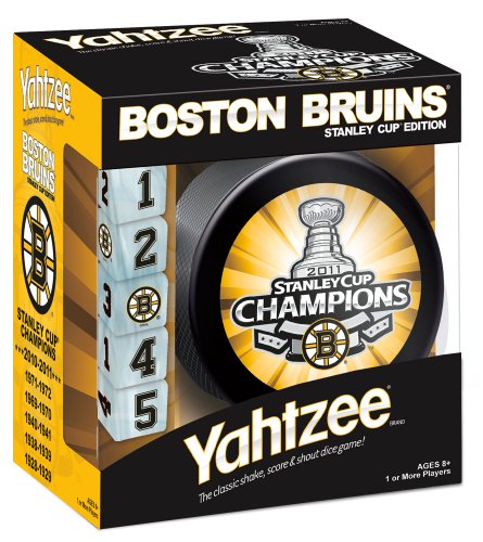 Shake up the classic Yahtzee dice game with some NHL flair This collectible team-themed set features a puck-shaped dice cup score pad and custom dice all featuring your teams logo Includes collectible Bruins dice cup with lid 5 custom dice Recommended for ages 8 and for 1 players Read More..